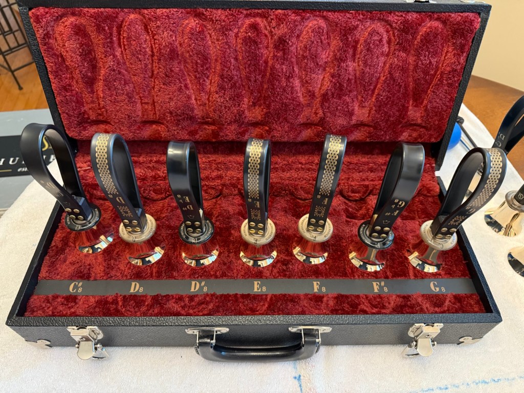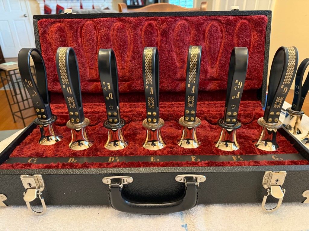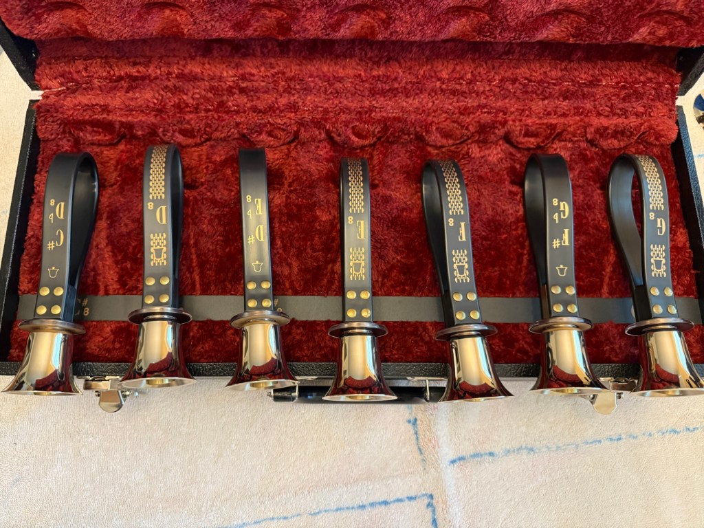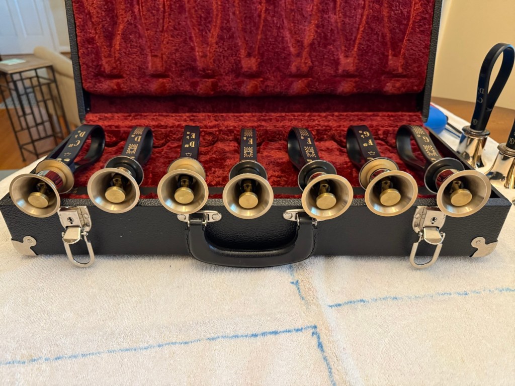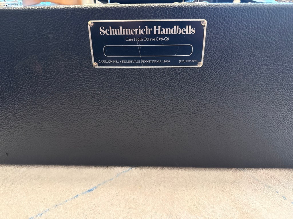 Very rare on the used market. Schulmerich upper 6th octave in excellent condition. Bells have the mid era style handles and the newer handguards. Castings, handles, hanguards, and clappers all in great condition. Bells have been polished and adjusted for optimal perfomance. New from the factory would sell for $2850. Available to you for $1650 and I will include free shipping and insurance to the lower 48 states. SOLD