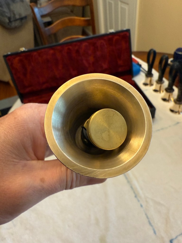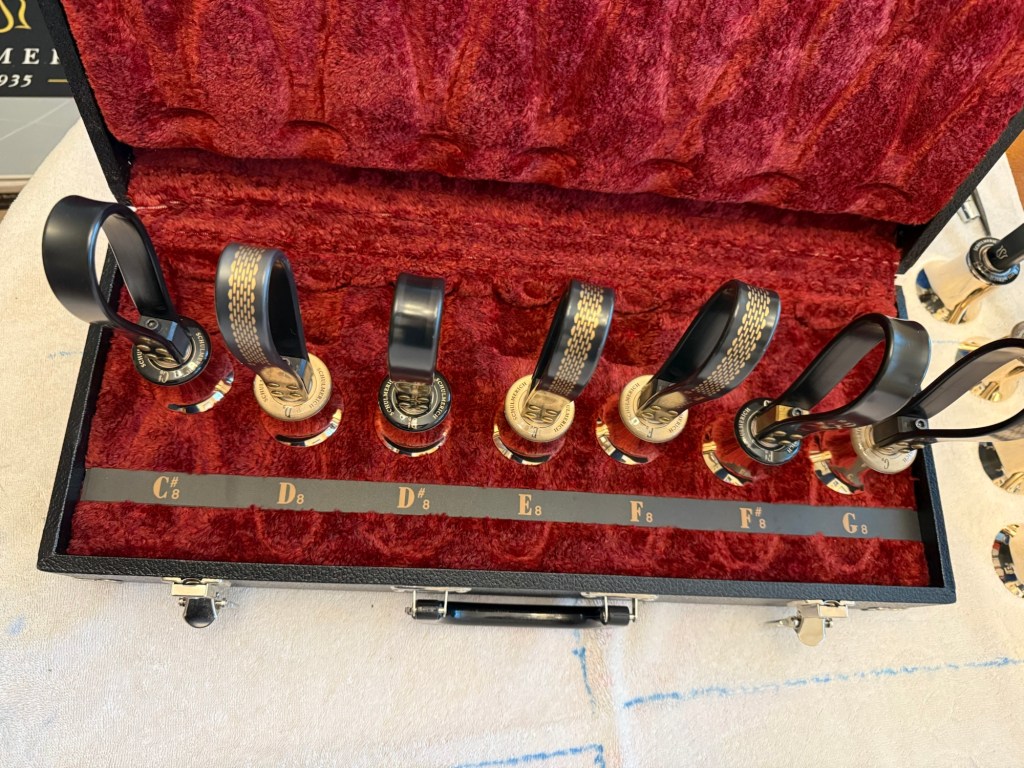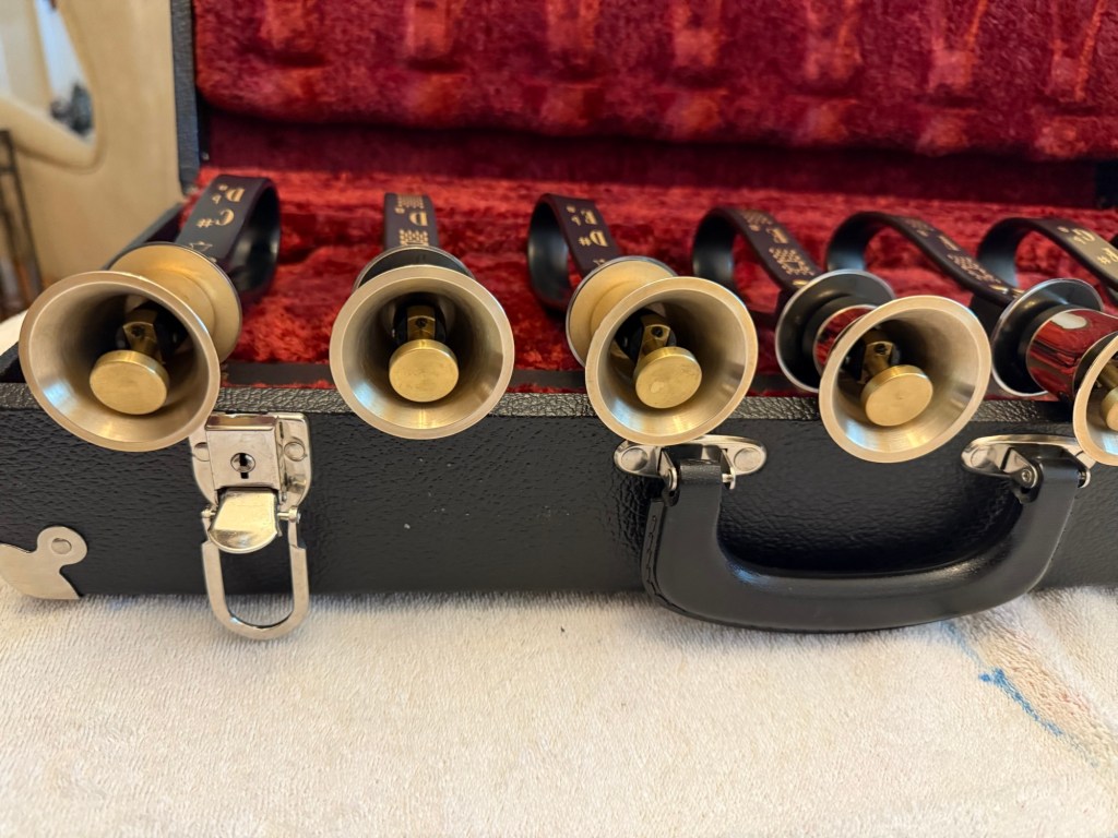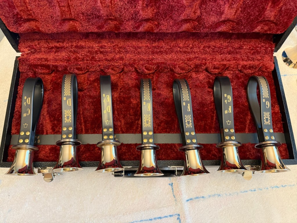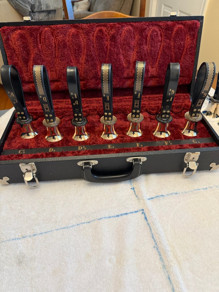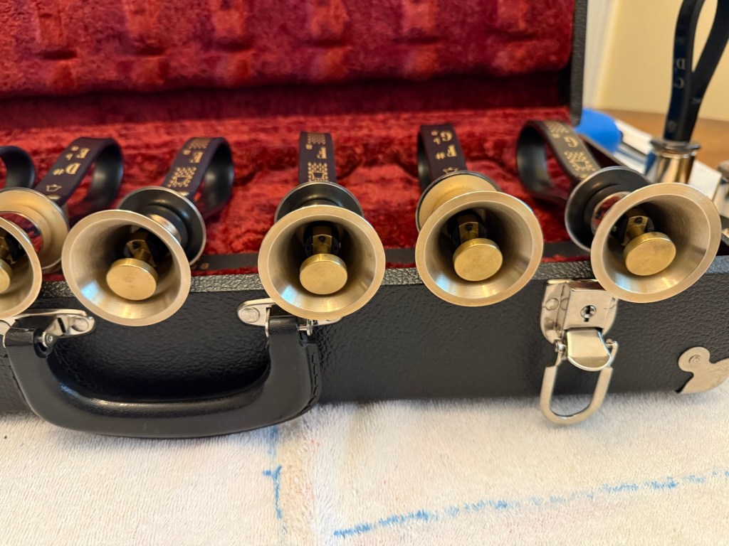 Very rare on the used market. Schulmerich upper 6th octave in excellent condition. Bells have the mid era style handles and the newer handguards. Castings, handles, hanguards, and clappers all in great condition. Bells have been polished and adjusted for optimal perfomance. New from the factory would sell for $2850. Available to you for $1650 and I will include free shipping and insurance to the lower 48 states. SOLD